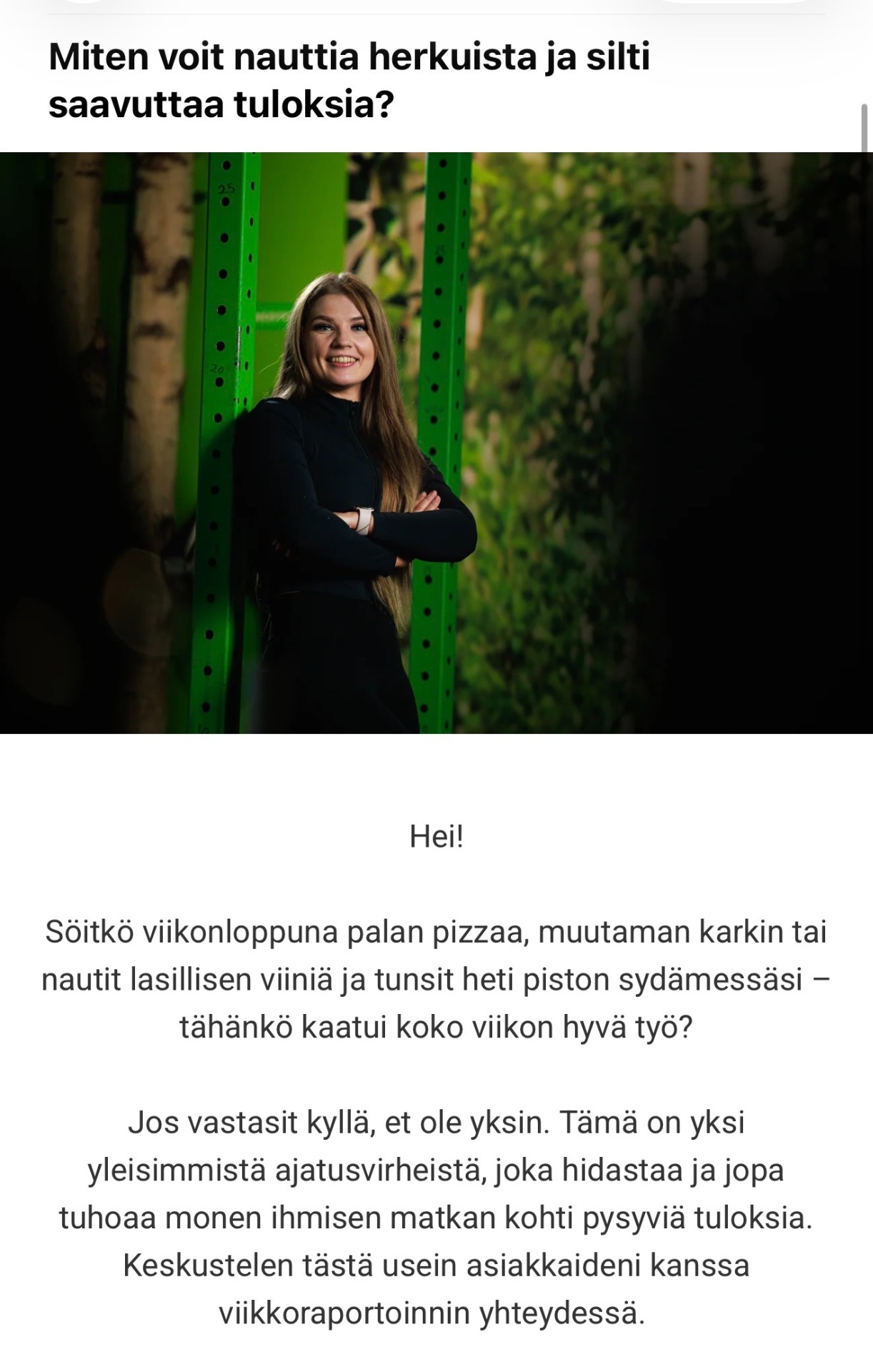 Elämäntapamuutos vaatii todella paljon myös resursseja myös henkiseltä puolelta sekä myös voimavaroja arjessa. Ongelmaa ei ratkaise se, että saat lapun miten syödä ja treenata. Joskus voi olla helpompi ettemme muuta mitään muuta kuin yhden asian arjessa, josta tehdään pysyvä. Tämän vuoksi teen ohjeista personoidut. Se mikä sopii yhdelle - ei sovi taas toiselle.