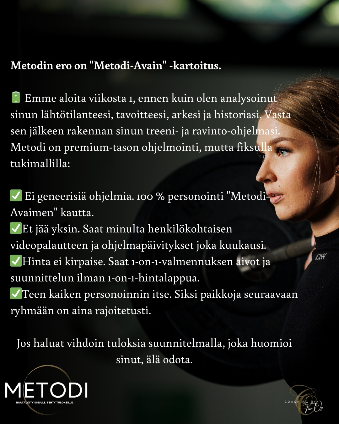 Miksi paikkoja on rajoitetusti? Toisin kuin massavalmennuksissa, minä teen jokaisen ohjelman itse ja kuvaan jokaisen palautevideon henkilökohtaisesti.